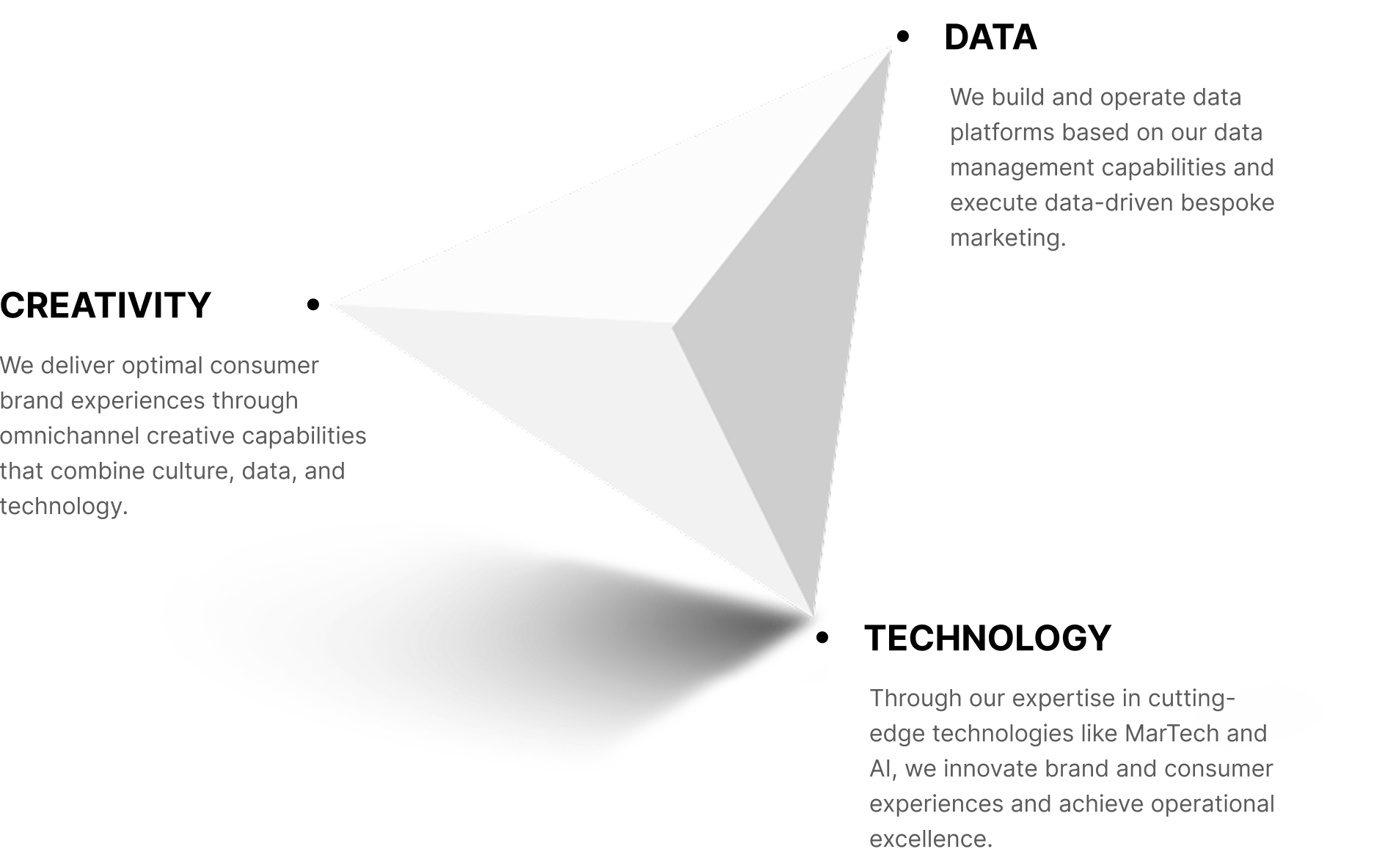 We refine, integrate, and analyze the DATA—the starting point for deeply understanding consumers—to discover the genuine insights hidden within. The deep understanding of consumers transforms into powerful CREATIVITY in the hands of creators. It is then delivered to consumers in the most effective and efficient way through our TECHNOLOGY.