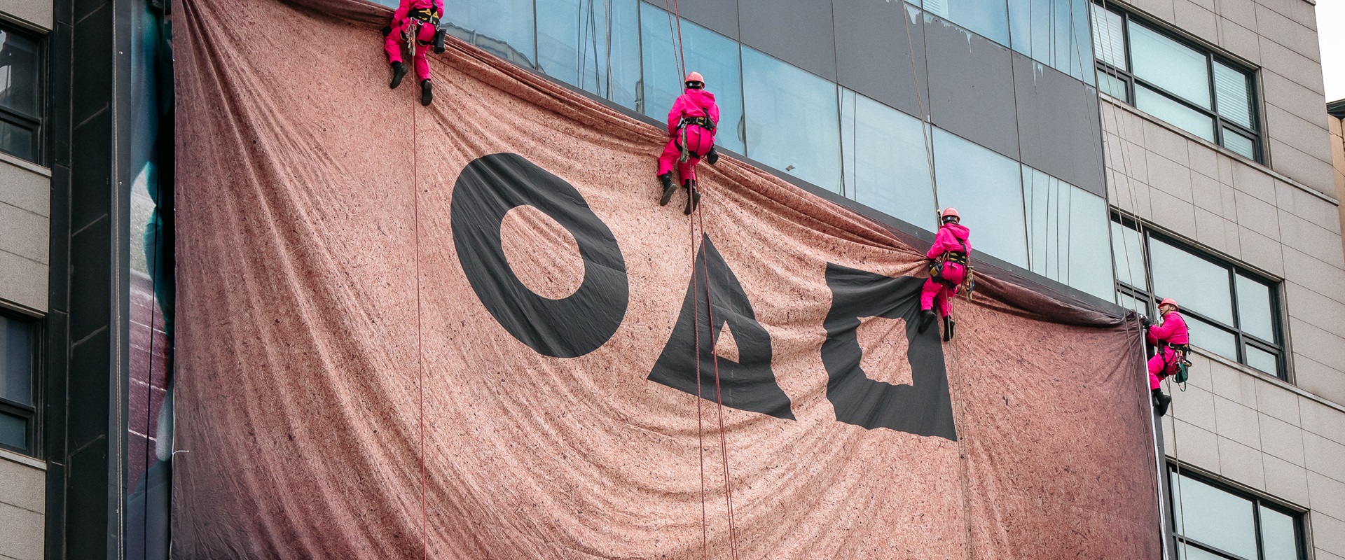 오징어게임의 가장 상징적인 IP인 핑크가드를 작업자로 활용해 엠바고 해제시점인 오전 9시에 맞춰 강남역에서 옥외광고 설치 퍼포먼스를 진행했습니다.