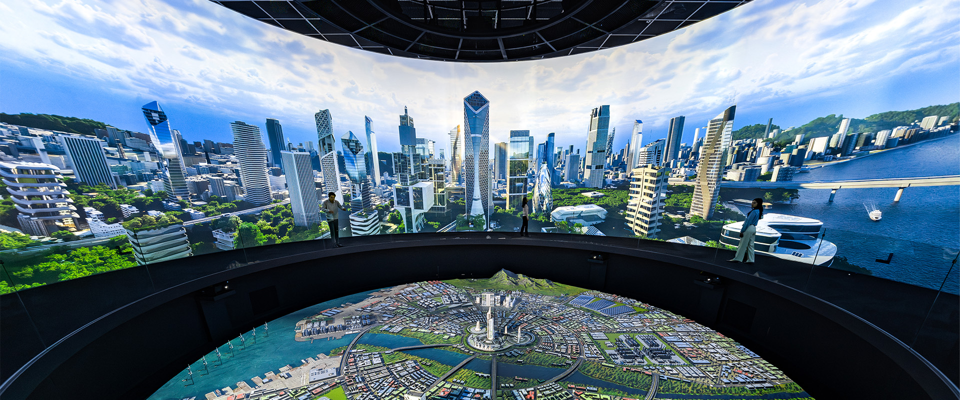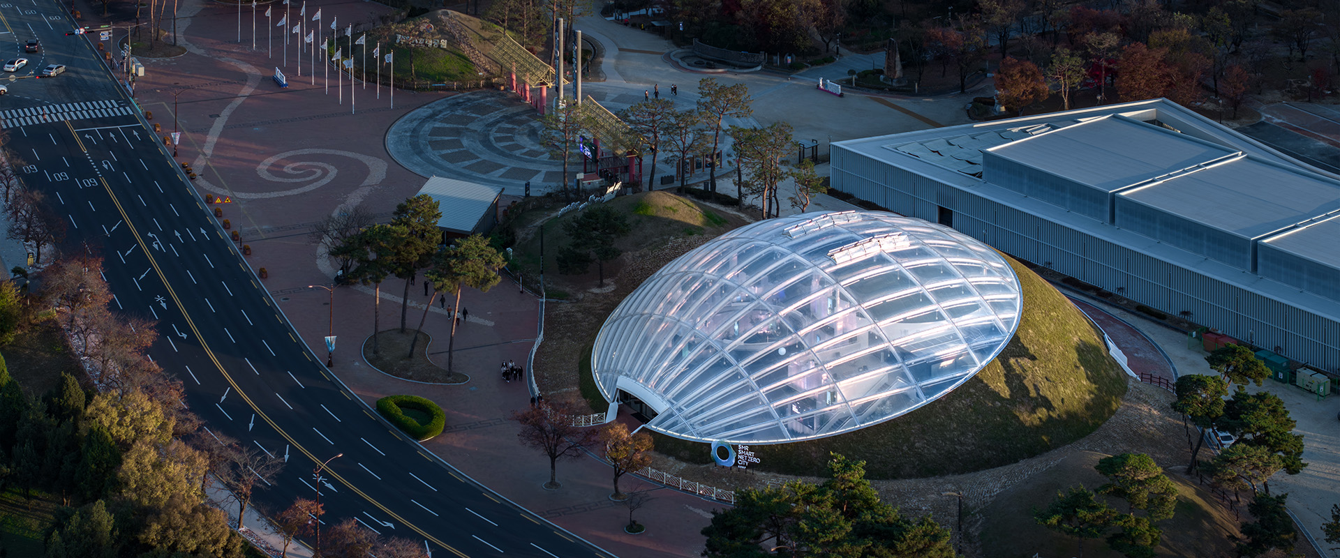 경주의 상징인 ‘고분’에서 착안해 전체 외관을 돔 구조로 설계하고, 로비부터 360° 메인 전시관까지 원형 요소를 일관되게 적용했습니다. 고분의 유기적인 형태를 구현하기 위해 ETFE를 외피 재료로 채택했으며 시공 효율화를 위해 사전 제작 철근 프레임 방식을 활용했습니다. 동시에 한국수력원자력의 기술로 구현된 탄소중립 도시 ‘넷 제로 시티’를 시각화해 기업의 핵심 메시지를 직관적으로 인지할 수 있도록 구성했습니다.